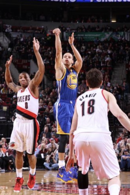 2、左手手掌最后保持外摆的姿势,就像下图库里的动作,从正面相对而视,库里的两手组成了一个“IS”的字母线条,加上前面说的第一点,最后整个左手包括手掌就是要变成S型。这个方式对于左手有习惯用力毛病的特别有效,左手在最后故意做出外摆的动作能保证绝对不会再用上任何力干扰到右手的出手了。